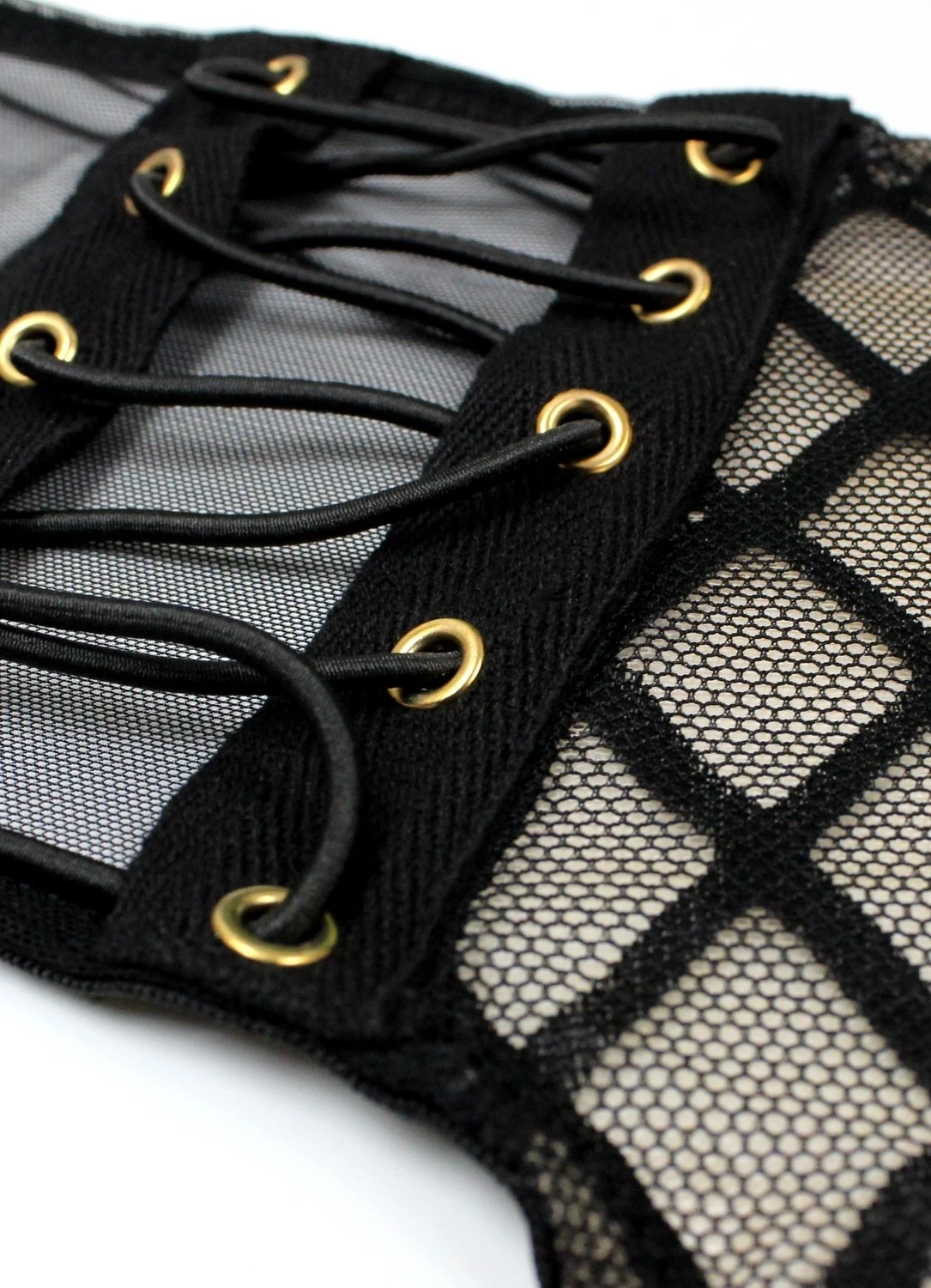 This sophisticated yet edgy high waisted knicker features gold eyelets, lace-up details and sensual mesh back. Wear it with the matching Nicky Bralette for a total knock-out.