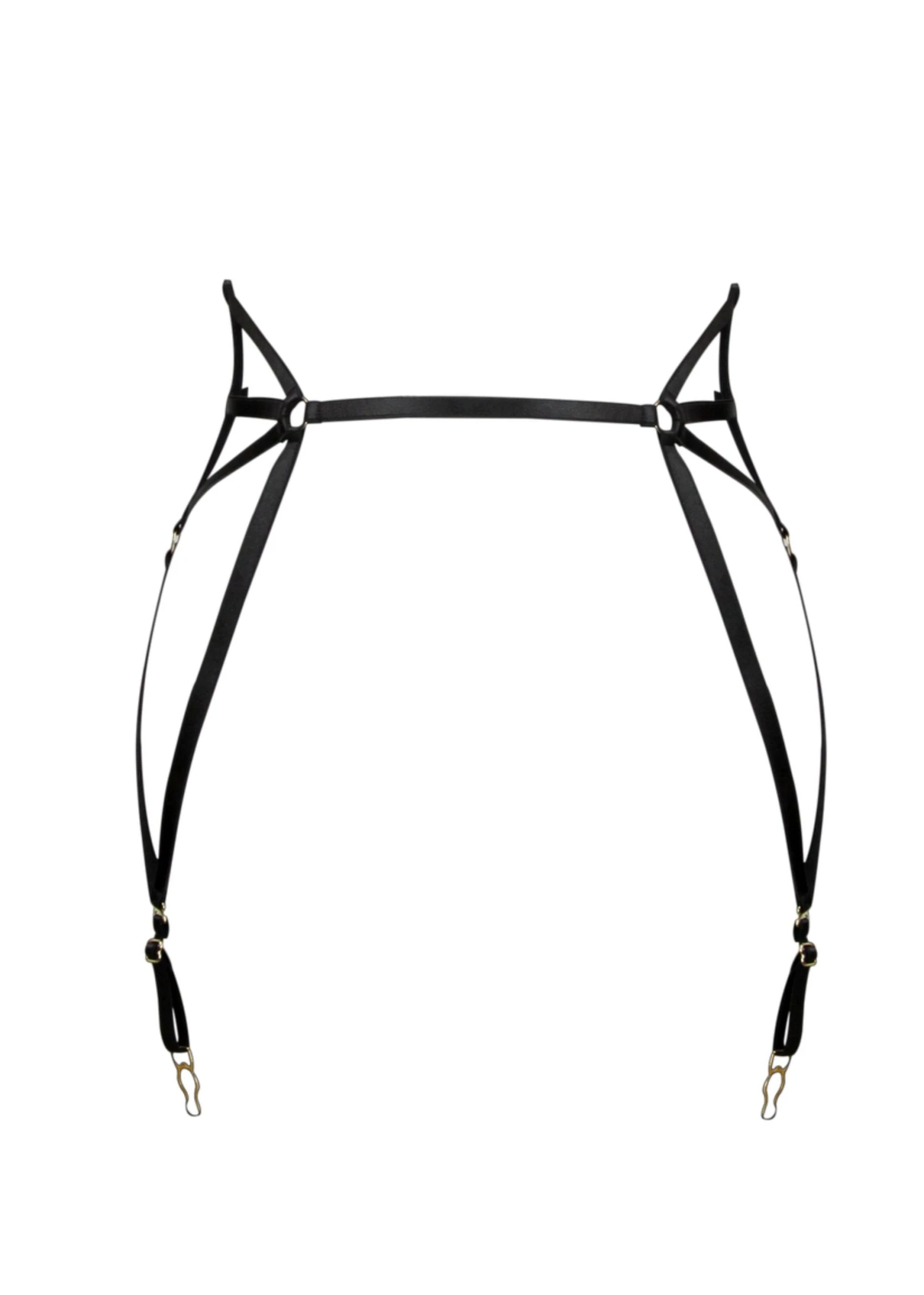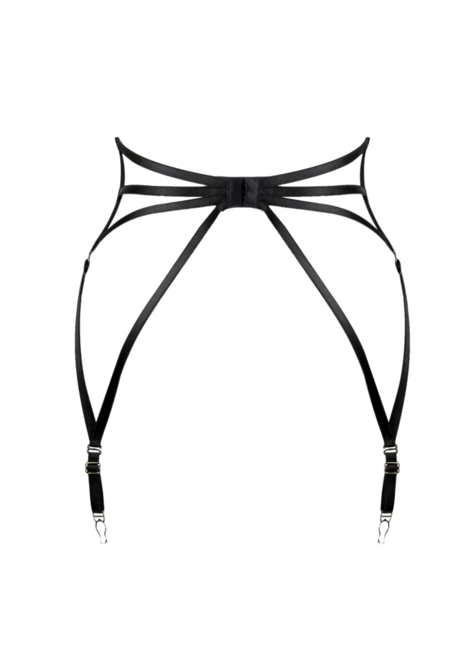With the daring strappy details accentuating the body curves, the suspender straps narrow down along the sides of the upper thighs along with the silhouette.