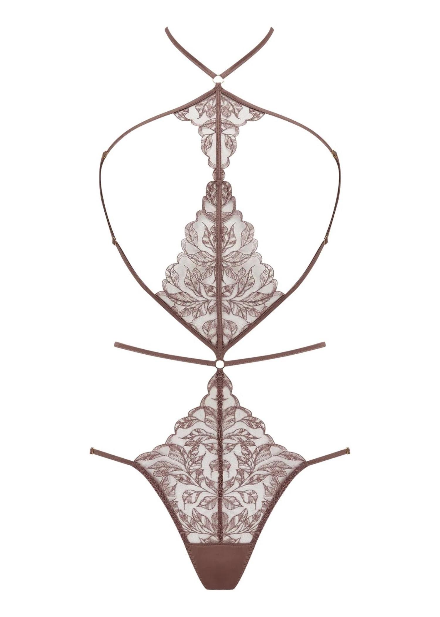 Elegant and yet daring, this playful playsuit with its floral embroidery is a unique take on the classic playsuit. The taupe silk bound straps and inverted triangle panels are timelessly beautiful while the delicate lace detailing across the bust adds a sensual element to your look.