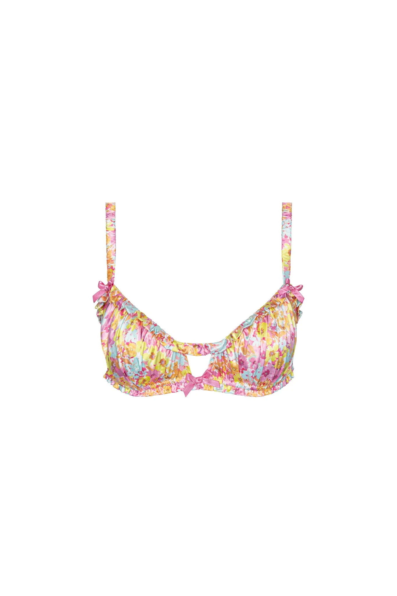 The sweetest thing about this flirty satin bralette? It’s difficult to choose between the shirred ruffles, bow accents, peekaboo cutouts, and cheerful allover floral print. Perfect paired with the matching Punch panty and garter.