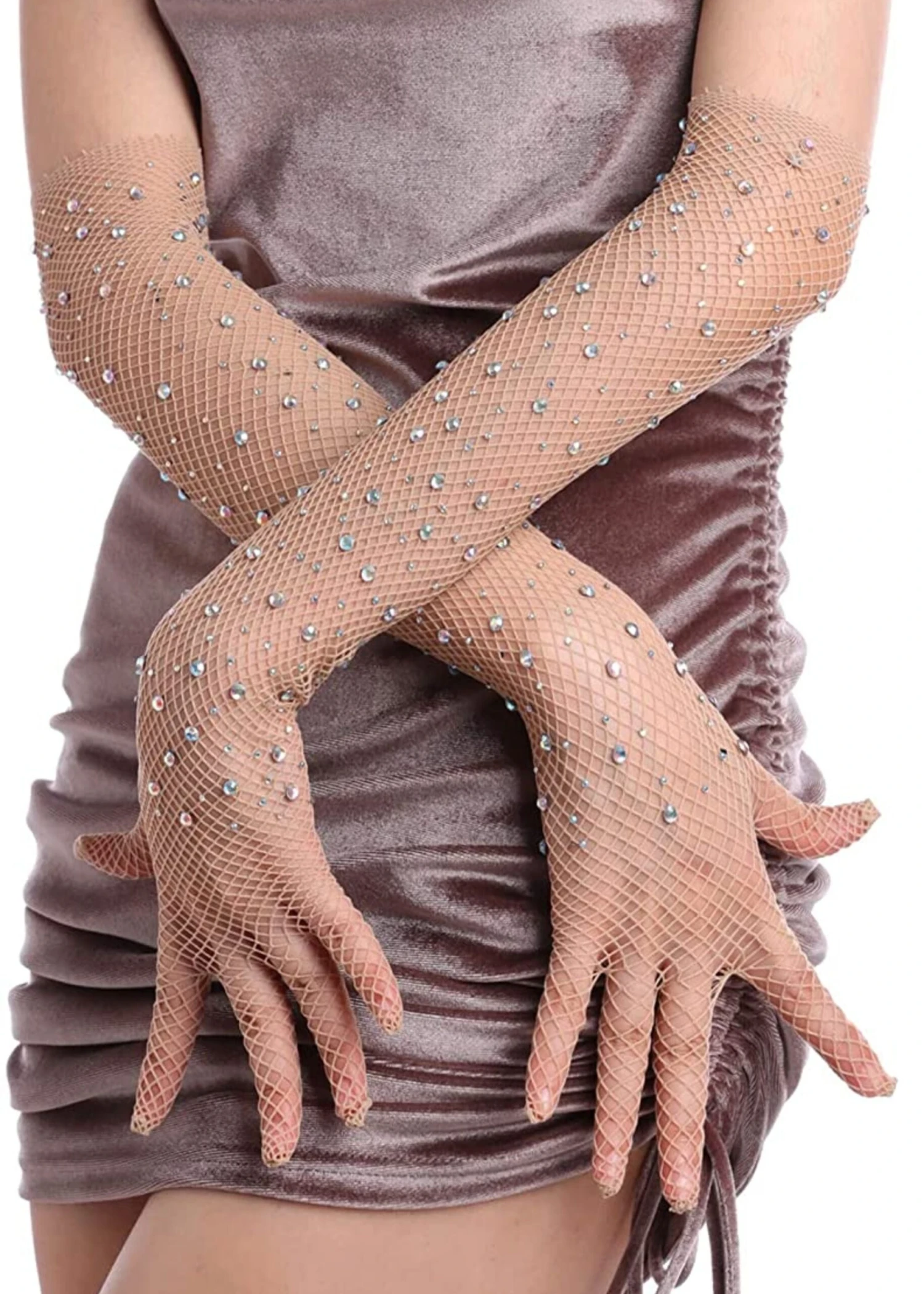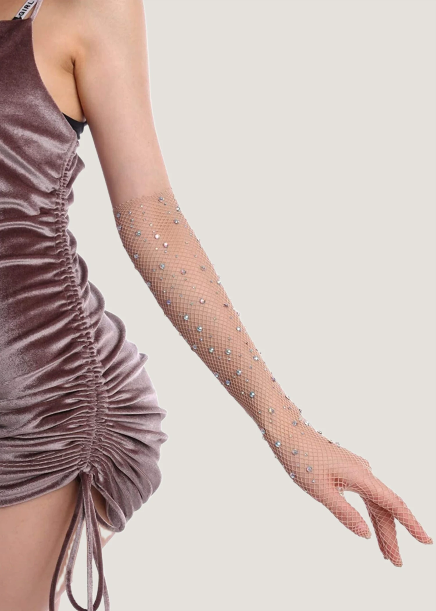 Experience the ultimate glamour and shine with our Rhinestone Fishnet Gloves. Perfect for special occasions, these chic full arm length gloves are sure to create a statement. Crafted with delicate rhinestones, these gloves offer elegance and sophistication. Look and feel like a queen with these luxurious accessories.