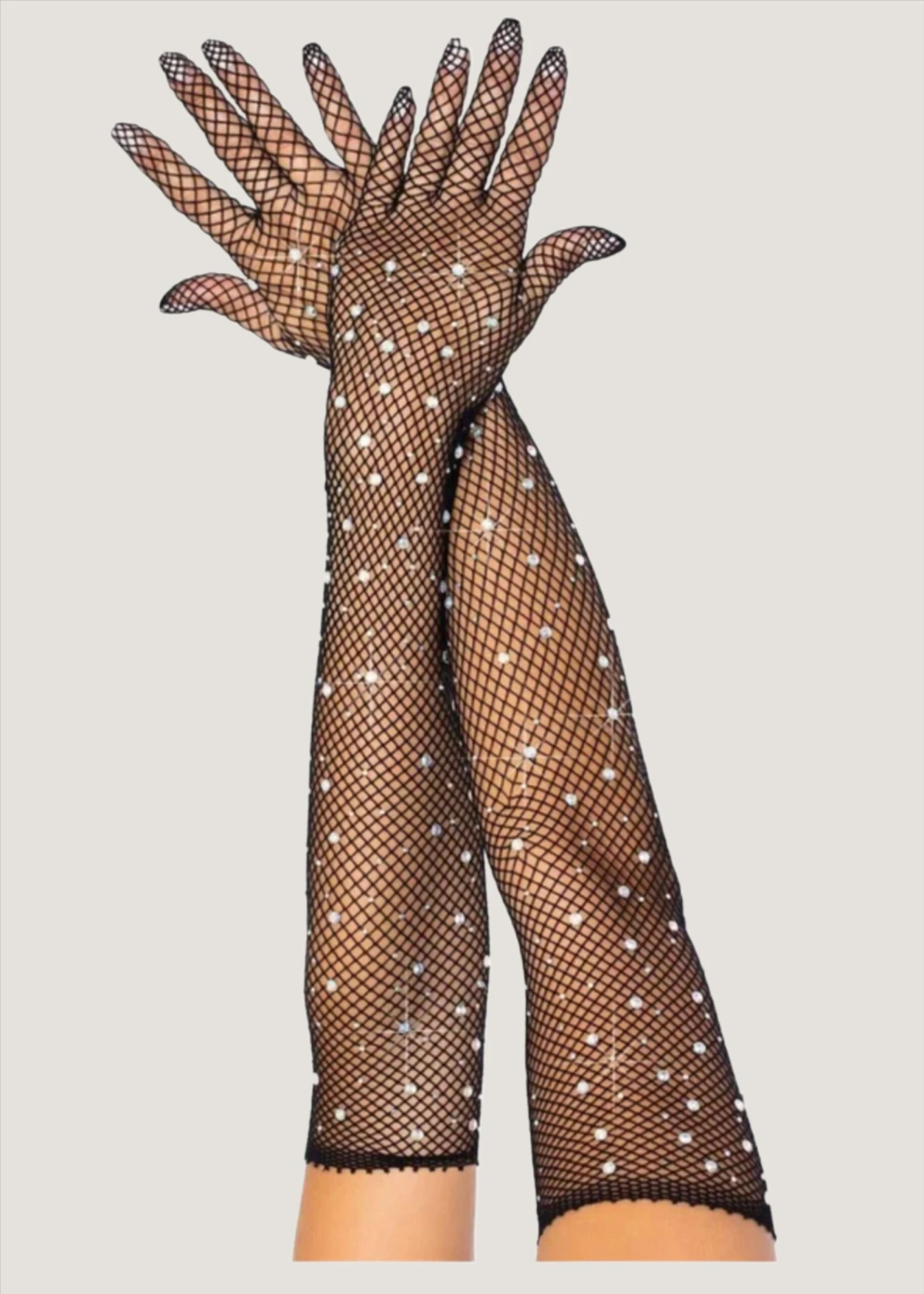 Experience the ultimate glamour and shine with our Rhinestone Fishnet Gloves. Perfect for special occasions, these chic full arm length gloves are sure to create a statement. Crafted with delicate rhinestones, these gloves offer elegance and sophistication. Look and feel like a queen with these luxurious accessories.