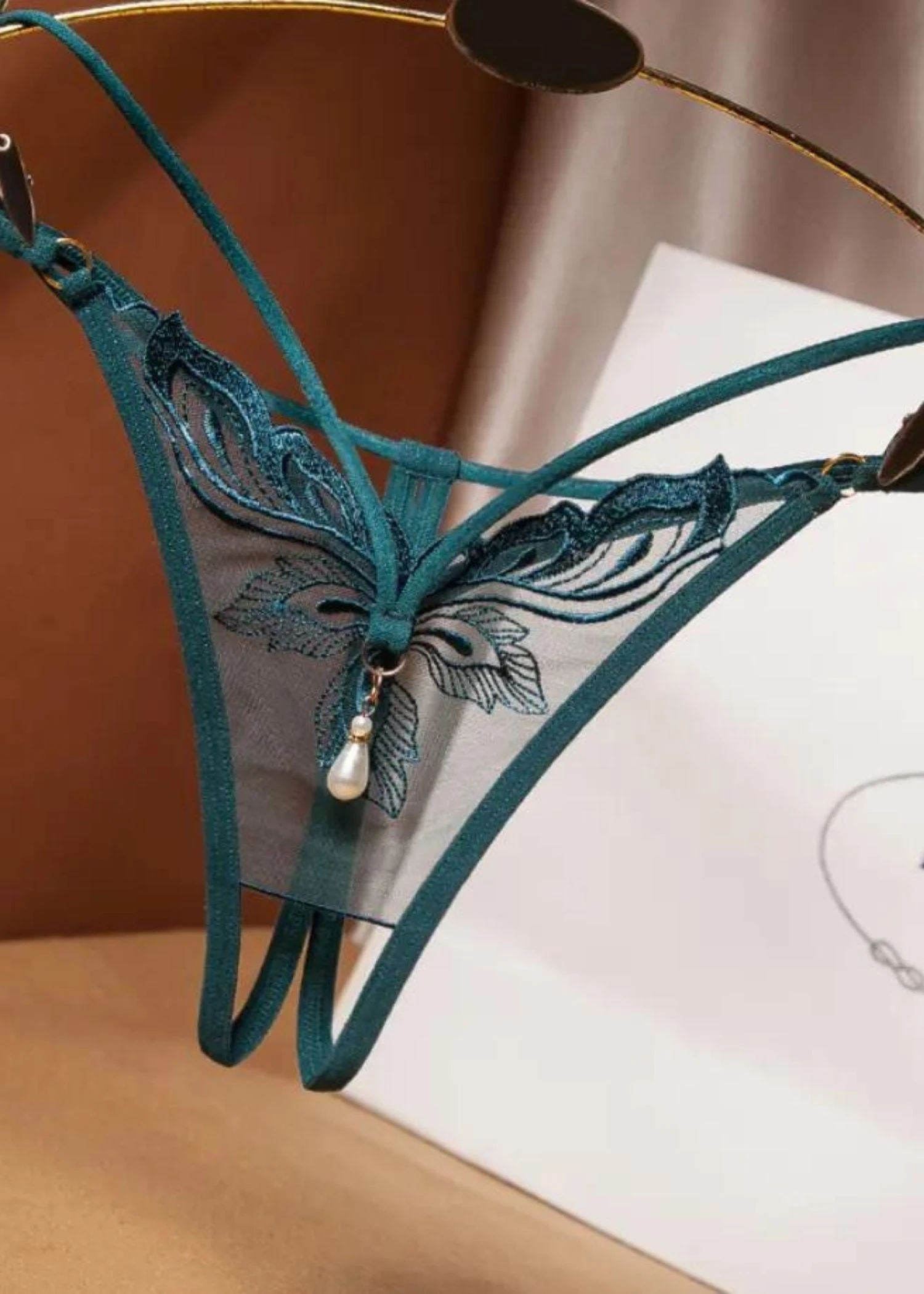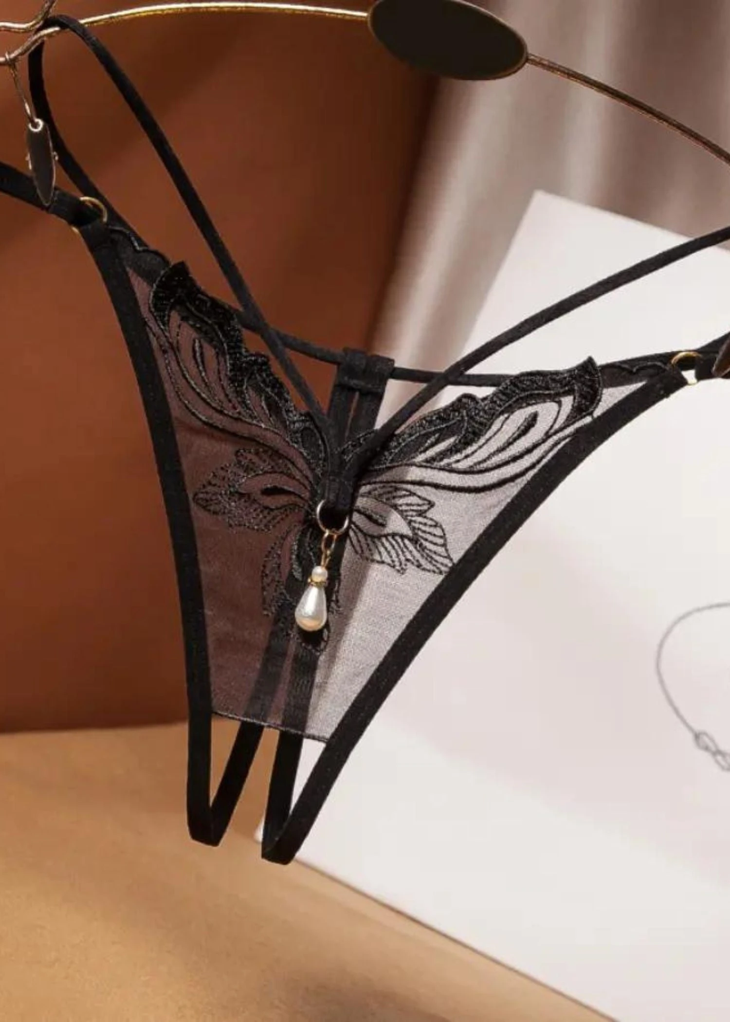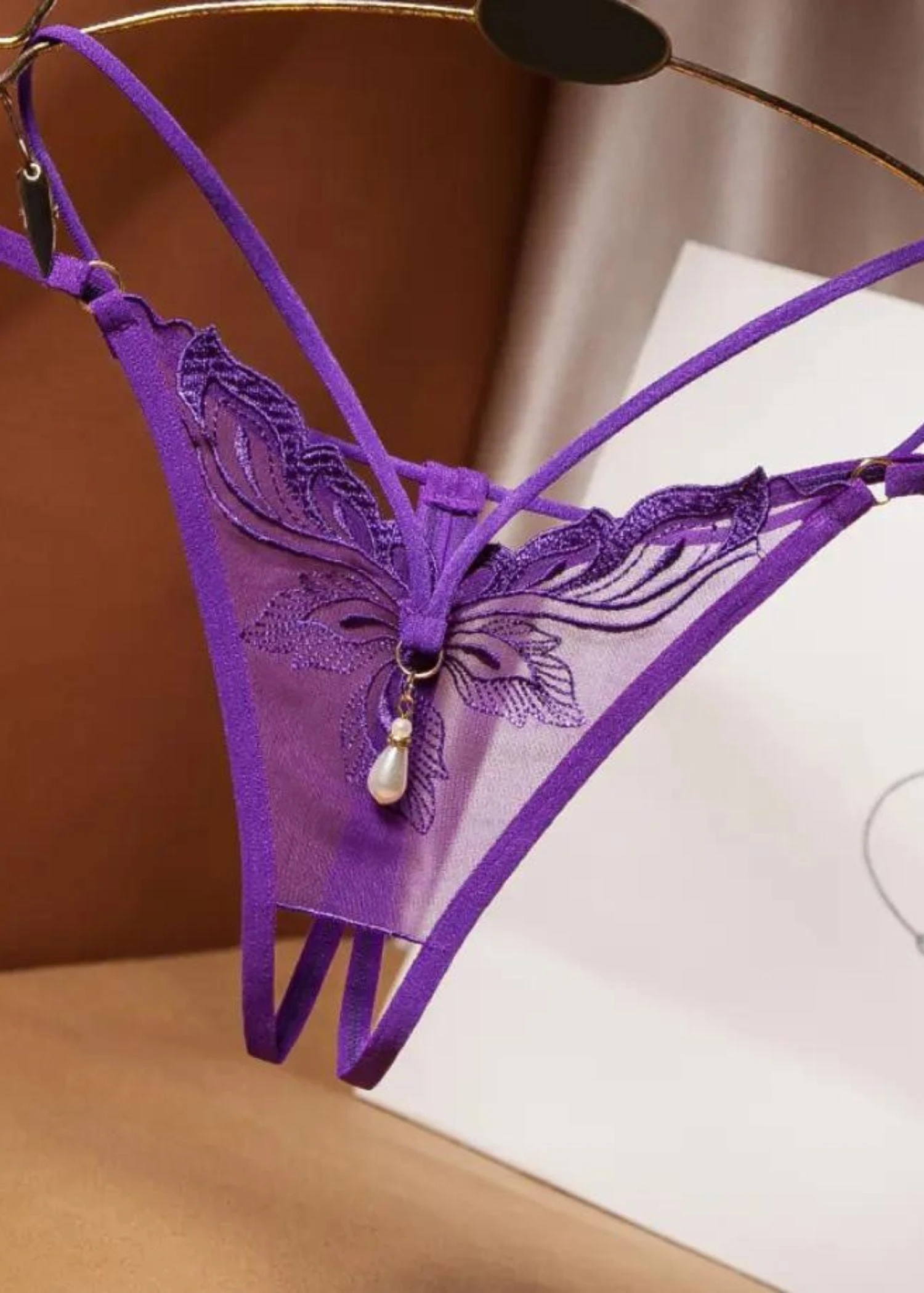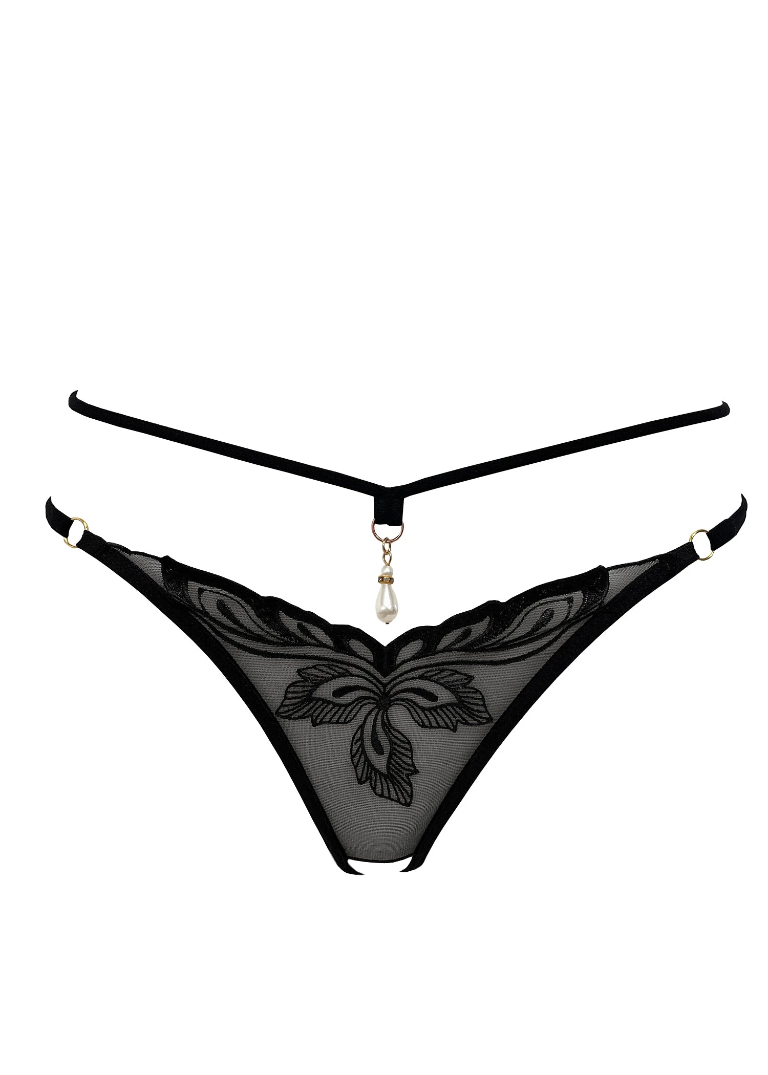 Experience the ultimate in luxury lingerie with the Stella Crotchless Pearl Thong! This gorgeous open thong is alluringly crafted with delicate lace embroidery & pearl hardware in the front panel, while the unique small opening in the back of the design provides a luxuriously sexy look & feel.Â