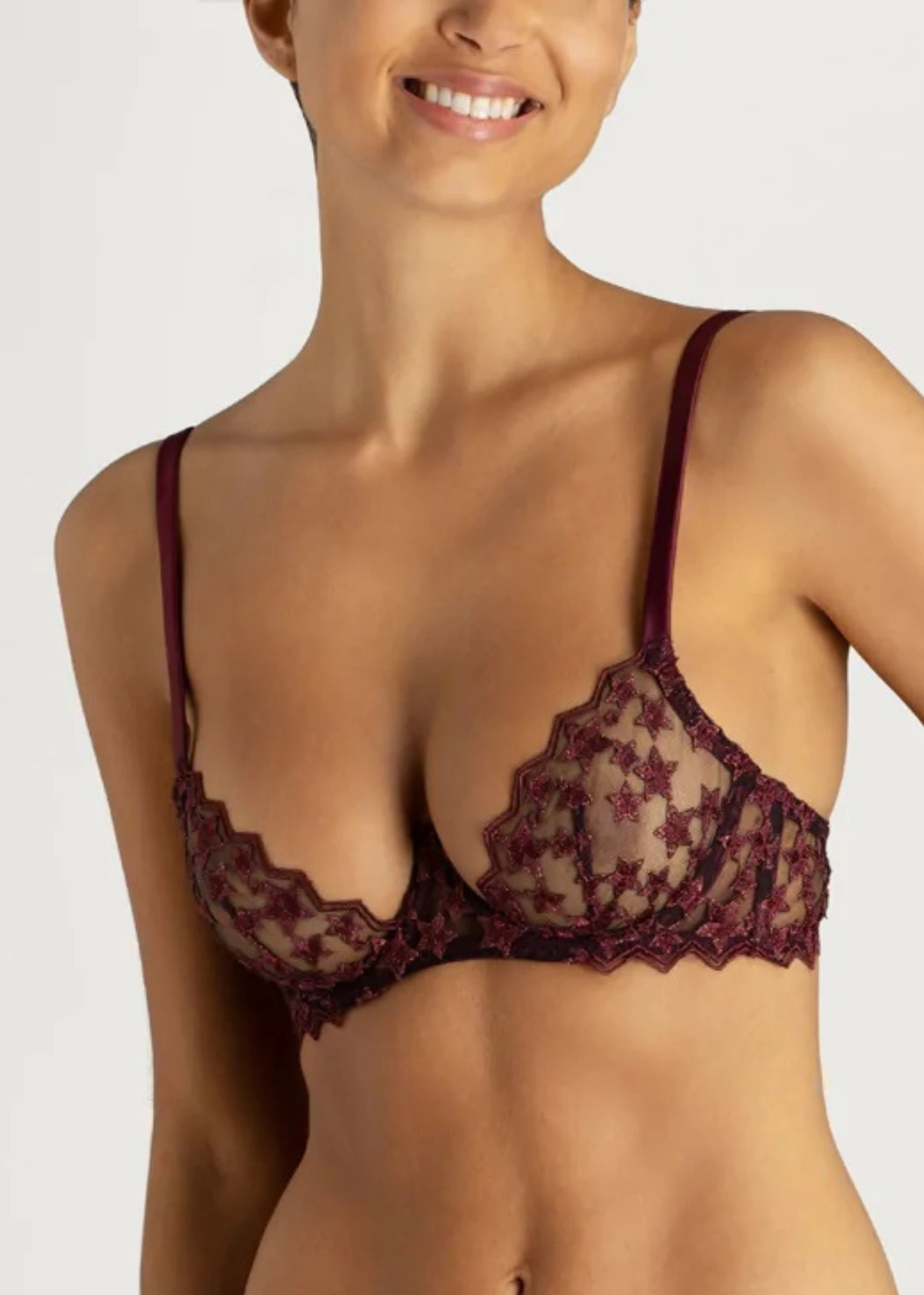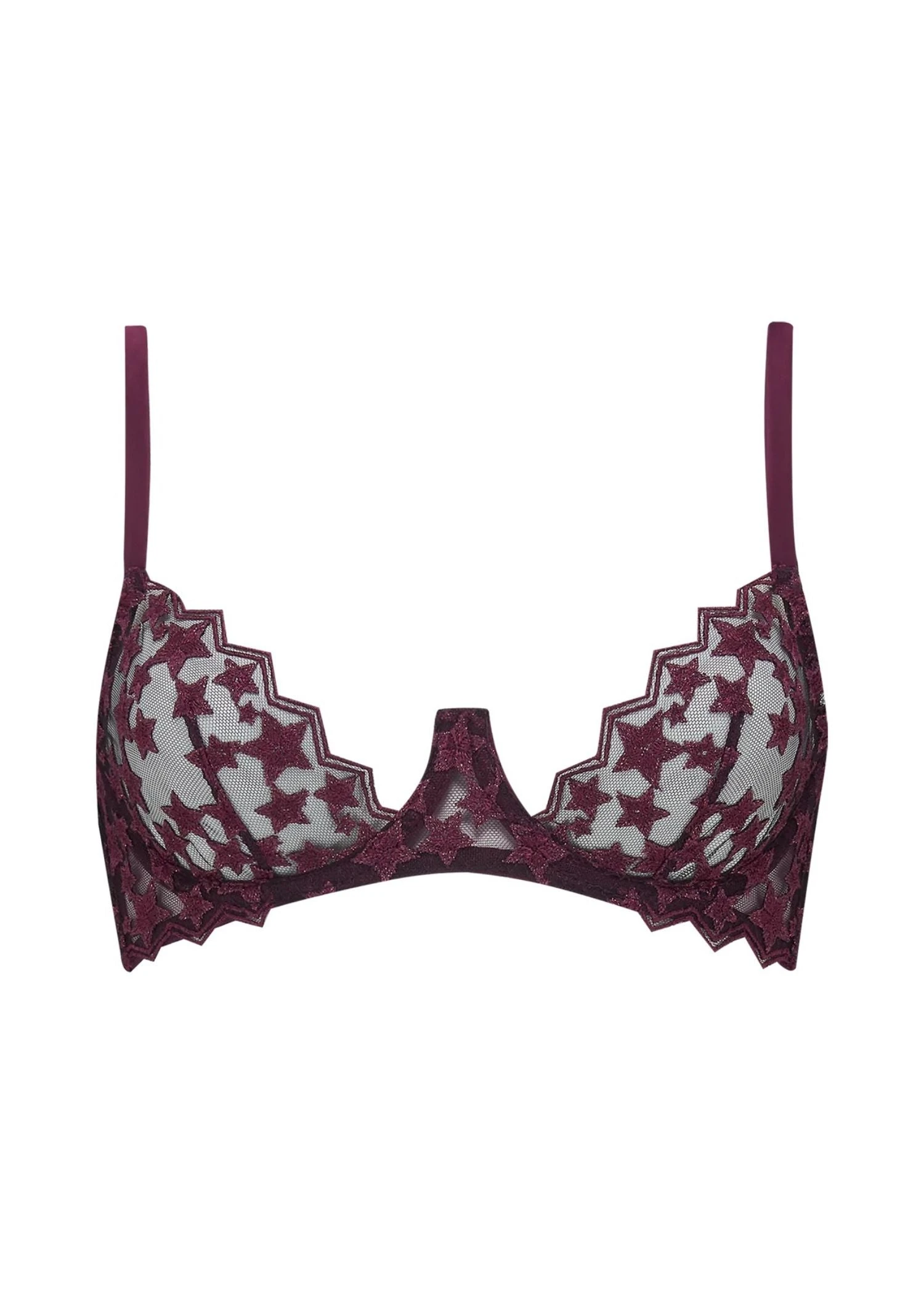 With an ultra plunge neck line, this Muse Stella Plunge bra frames and enhances your cleavage beautifully. Made with striking star embroidery and full underwire, it has such a dramatic silhouette especially in the rich plum tones. Complete the look with the matching Stella Brazilian Knicker or Stella Thong