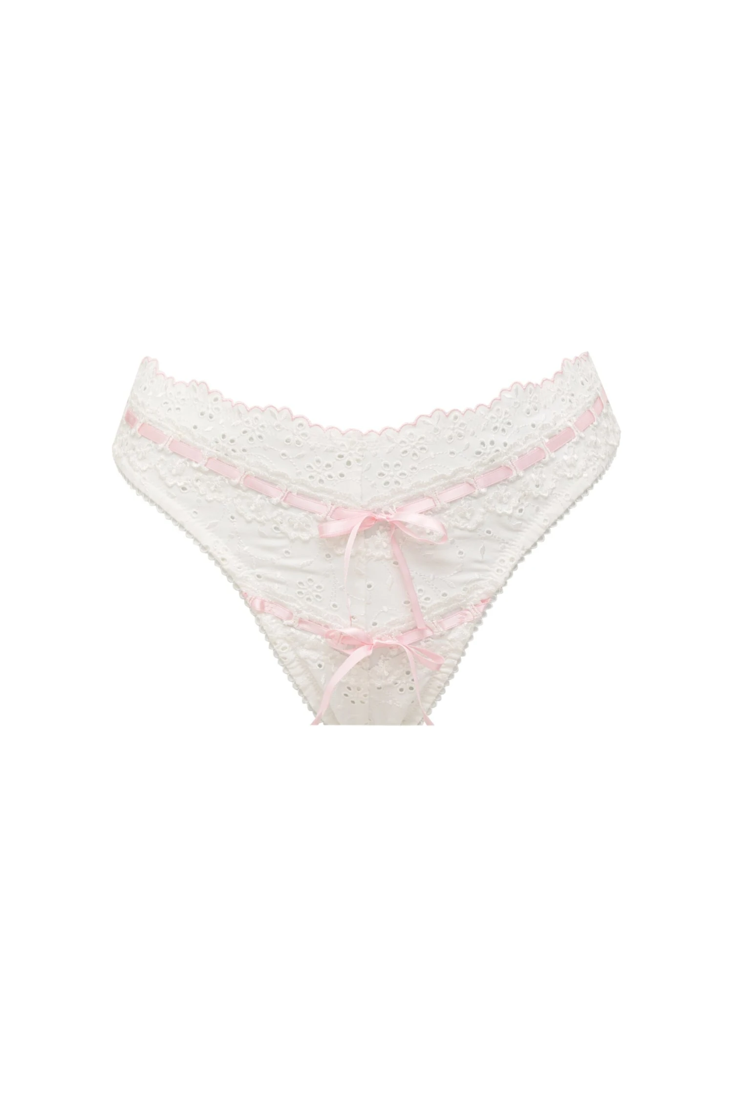 This impossibly sweet panty mixes together soft jersey and feminine eyelet trim. Finished with scalloped edges and pink ribbons.