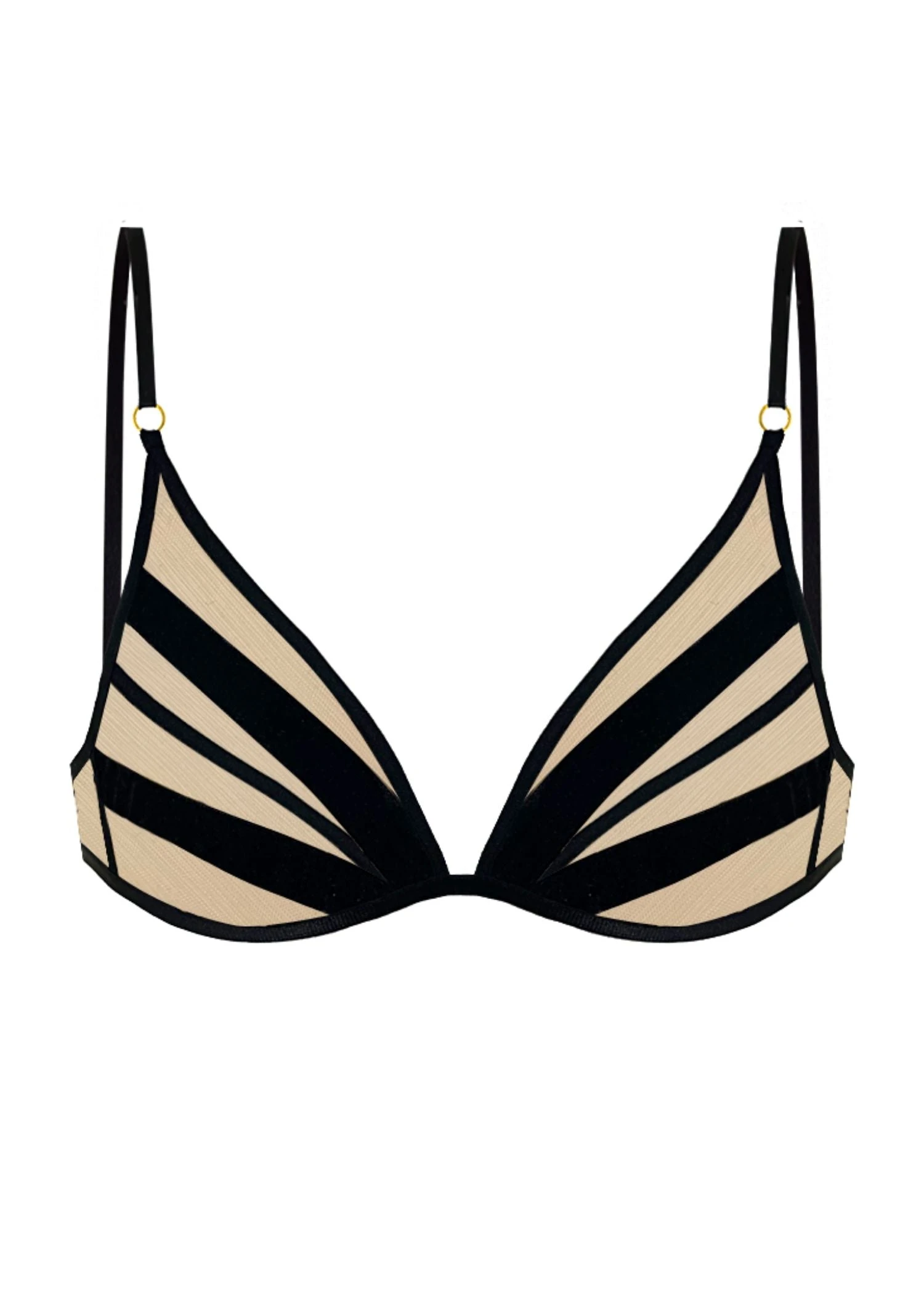 The Vanua Bra alternates wide and thin black velvet strapping on nude mesh for a minimal yet elevated look. Accented with gold-tone hardware. Pair with the Vanua thong for the complete look.