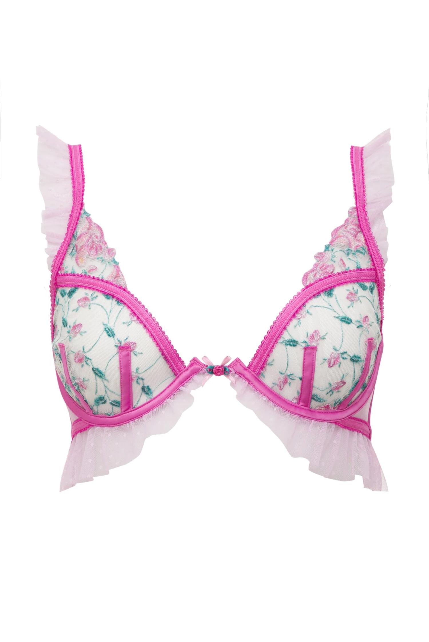 For the frill of it all. Dainty blooms and buds adorn sheer mesh while lacy, ruffled polka dot hems and rose bow accents add a bit of sweetness.