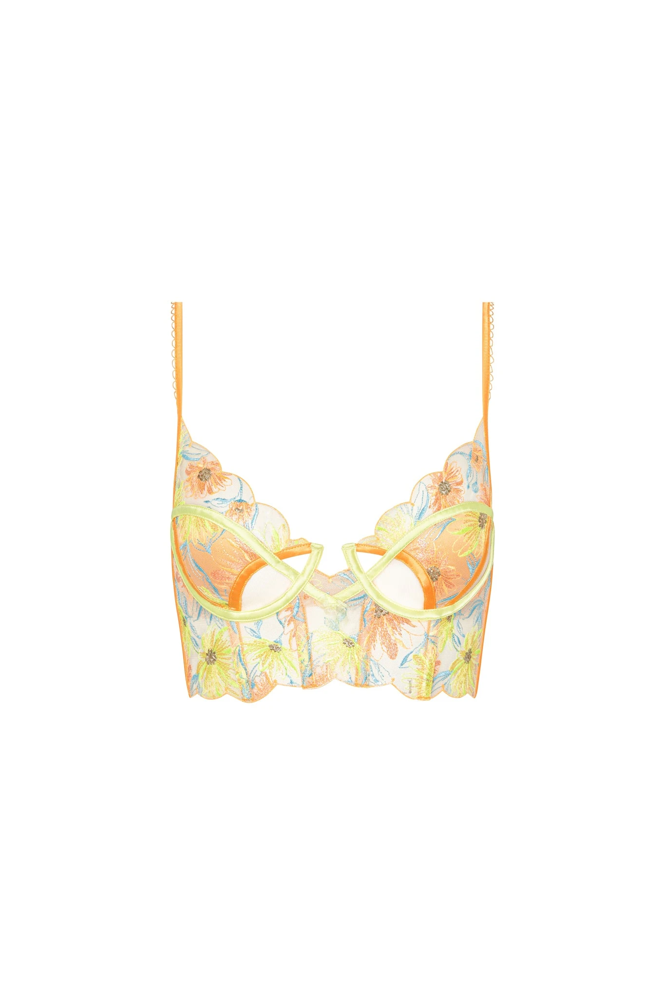 Channel your inner impressionist in an exquisite corset featuring floral embroidery that evokes lush water lilies in soft neons. Completed with notched underwire cups, cutouts, and a strappy cage back. Pair with the matching panty for all-out romance.