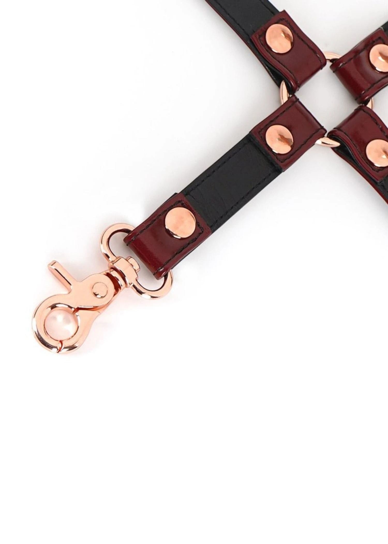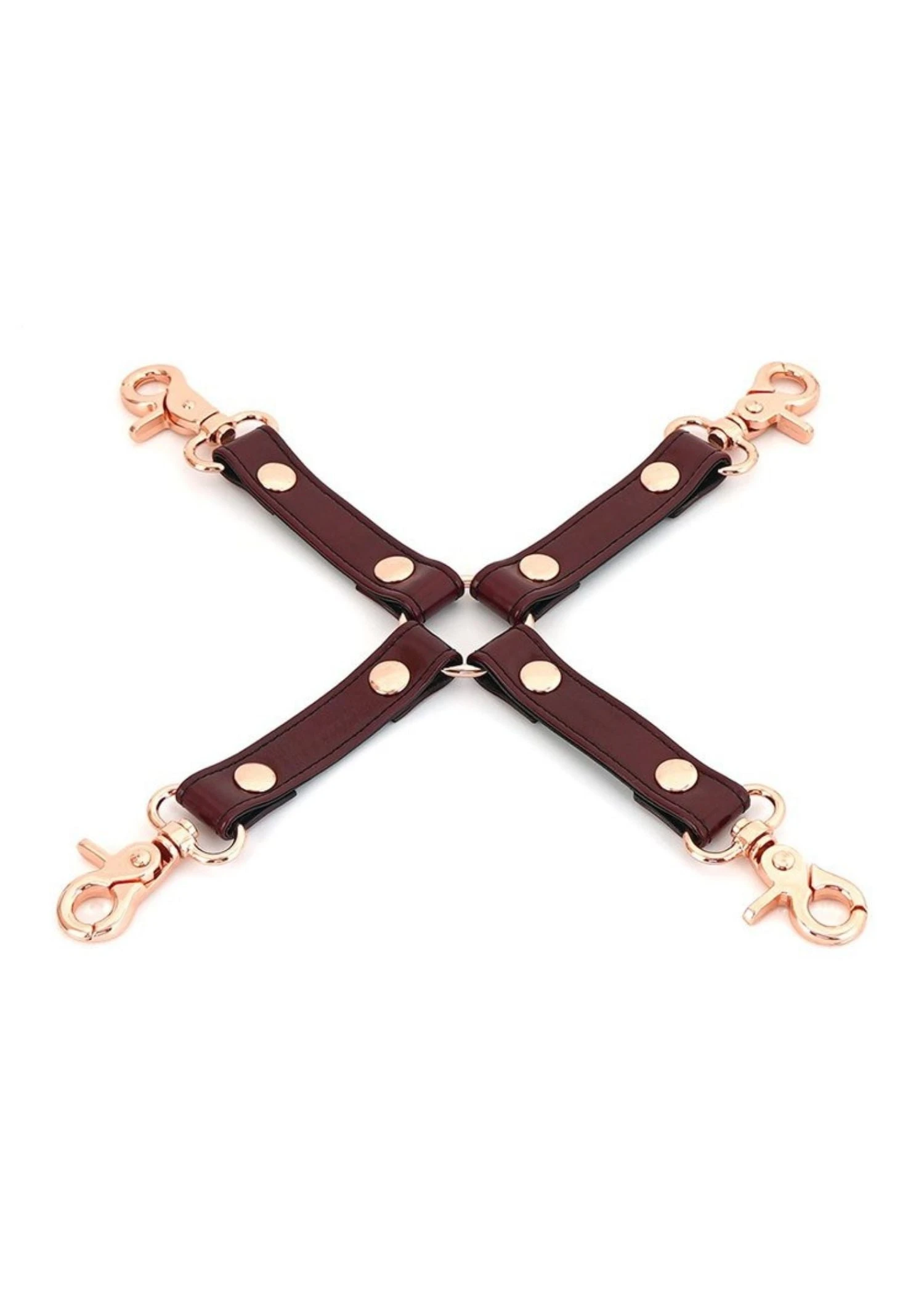 The new staple in your bedroom accessory collection. In a stunning wine red colorway and rose gold hardware, this durable genuine leather Hogtie creates a full body restraint when used with the matching Wine Red handcuffs and ankle cuffs (or thigh cuffs).