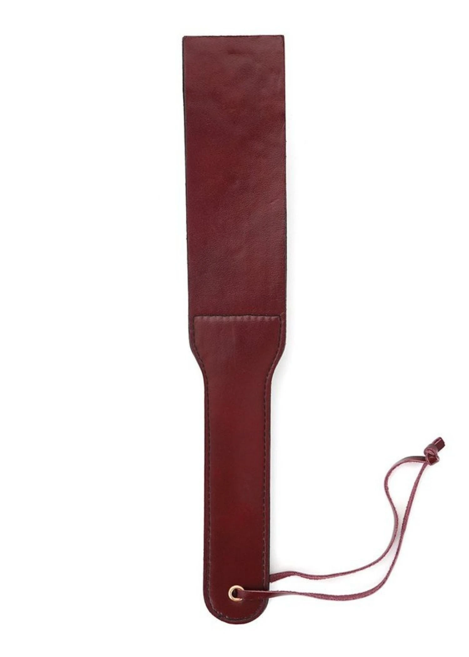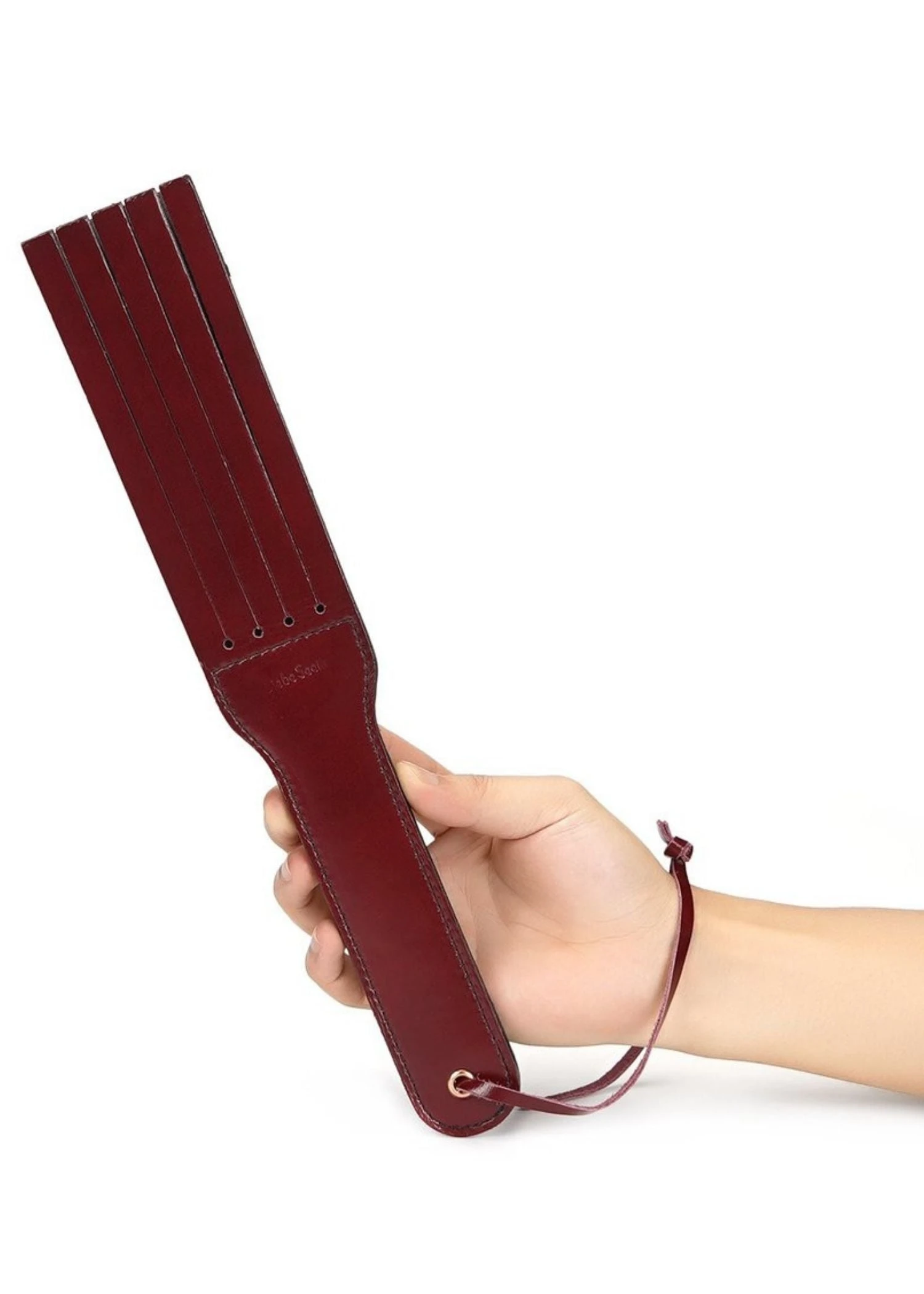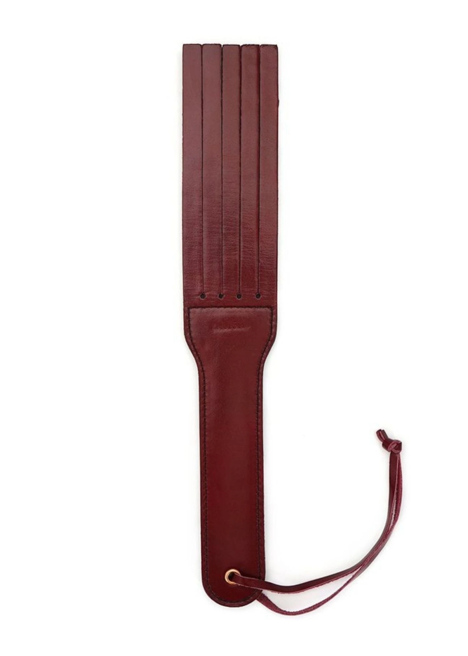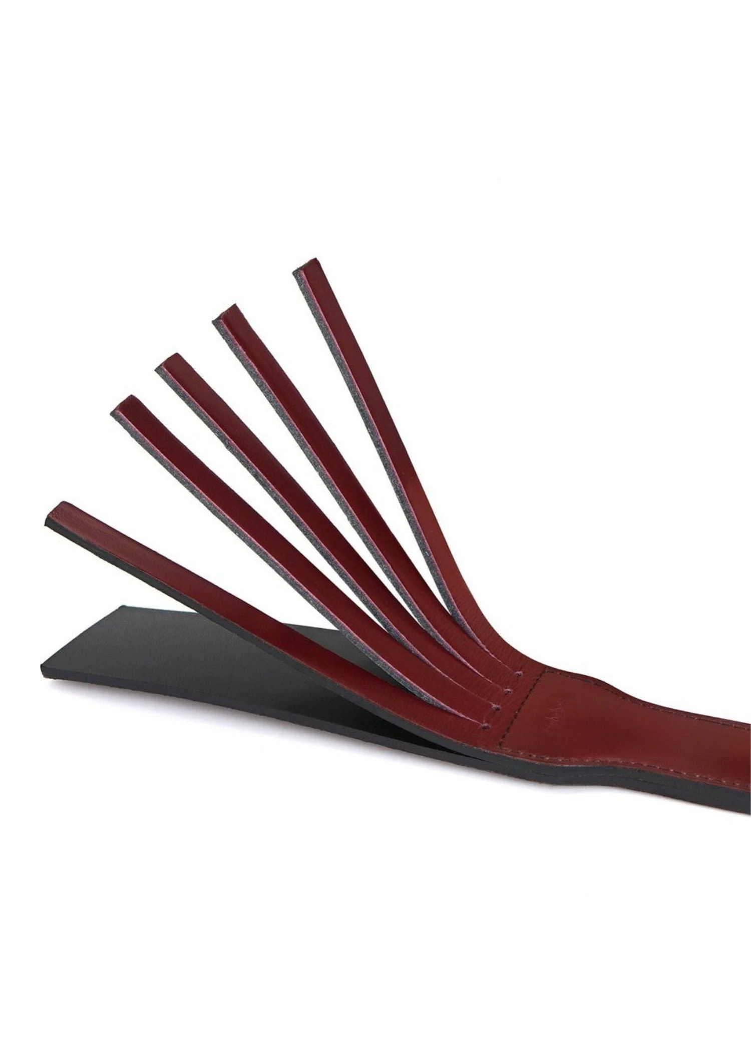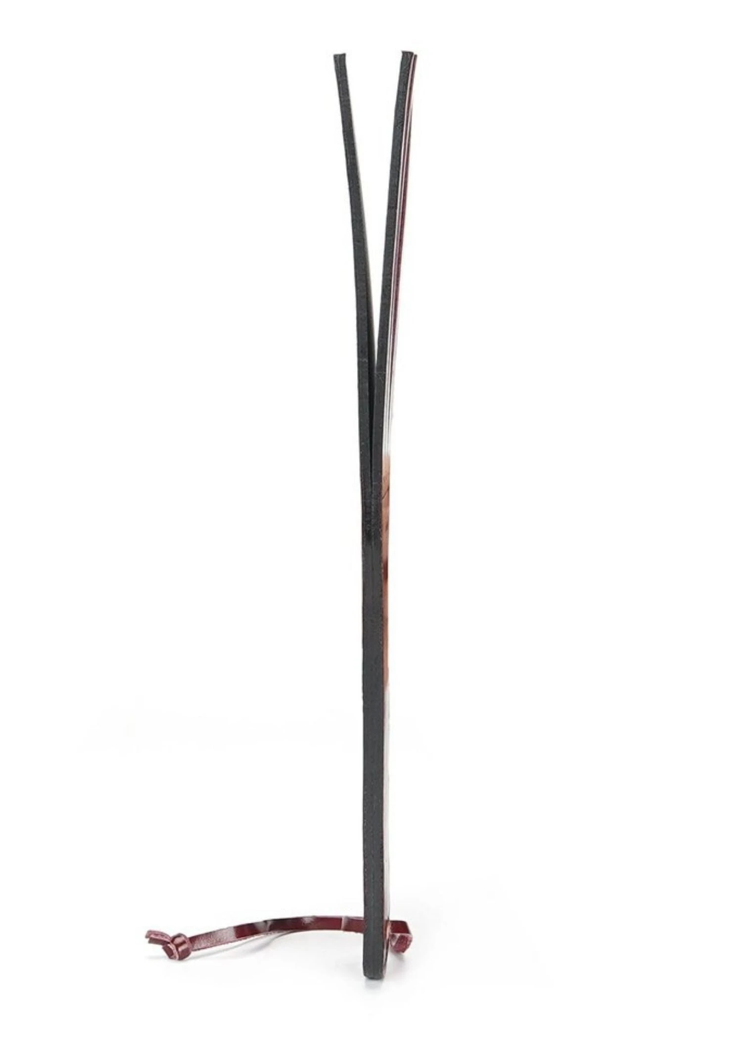 A piece of extravagance with two levels of pleasure. Created using genuine leather in a chic red wine hue, the Split Tawse Paddle offers a double-sided design for two different levels of sensations. Attached with a hanging loop for full control & storage